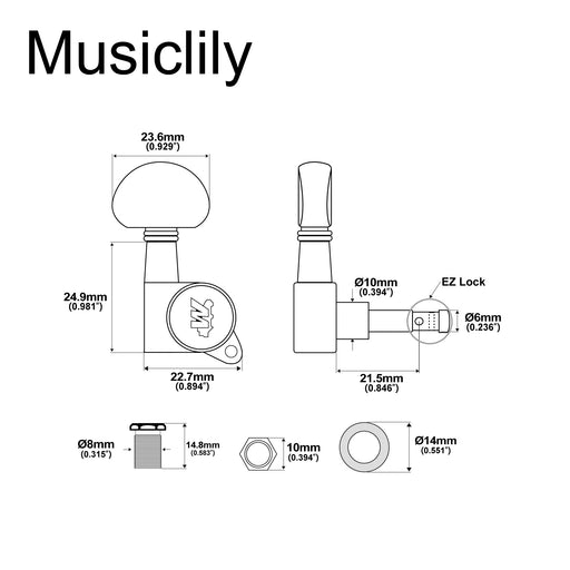 Musiclily ProFits electric bass Fits the modern standard 14mm(9/16 inch) peg hole Gear ratio 17:1, full sealed body Material: zinc alloy, with great electropla...
