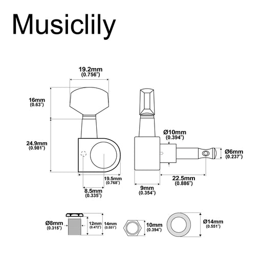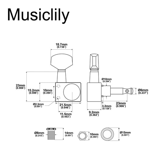 Musiclily ProFits electric bass Bushing outer diameter: 18mm(45/64 inch) Gear ratio 19:1, open gear design Material: zinc alloy, with great electroplated finis...