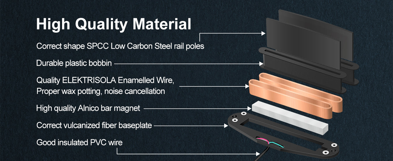 - Single coil sized rail blade humbucker, featuring Alnico 5 magnets, sounds thick and full, with high output, designed to emulate the famous Super Distortion sound, great for distortion, hard rock or metal. Dual-resonance coils with twin-blade poles allows the best string coverage and clarity, brings outstanding hum-canceling performance, especially for notes that are bent on the highest frets