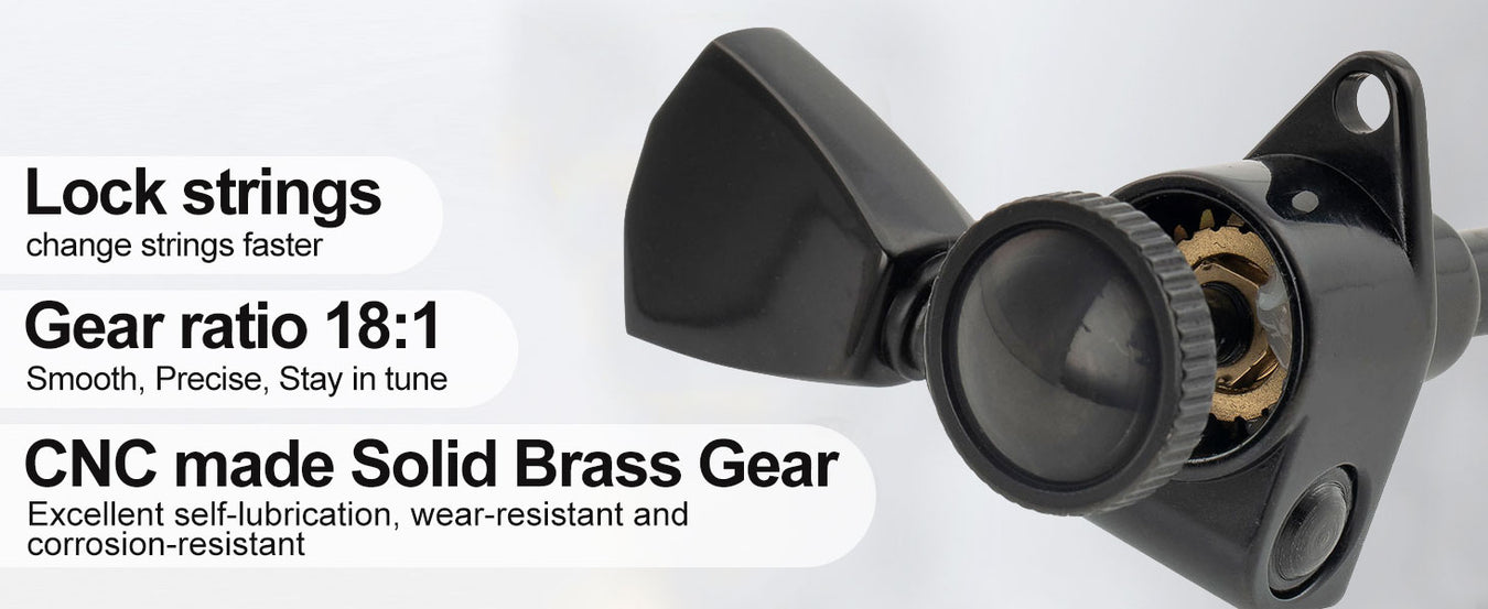 - Gear ratio 18:1, the retaining mechanism lock the strings in place, preventing them from slipping, improve tuning stability and make string changes much faster, turn smoothly and precisely, keep your guitar stays in tune