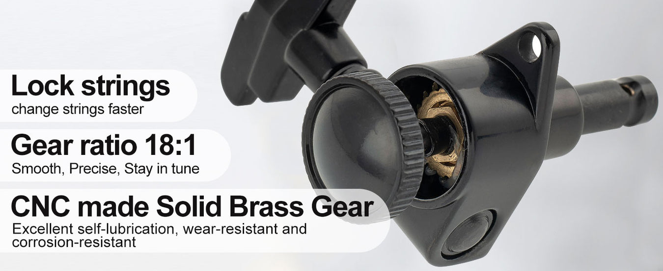 - Gear ratio 18:1, the retaining mechanism lock the strings in place, preventing them from slipping, improve tuning stability and make string changes much faster, turn smoothly and precisely, keep your guitar stays in tune