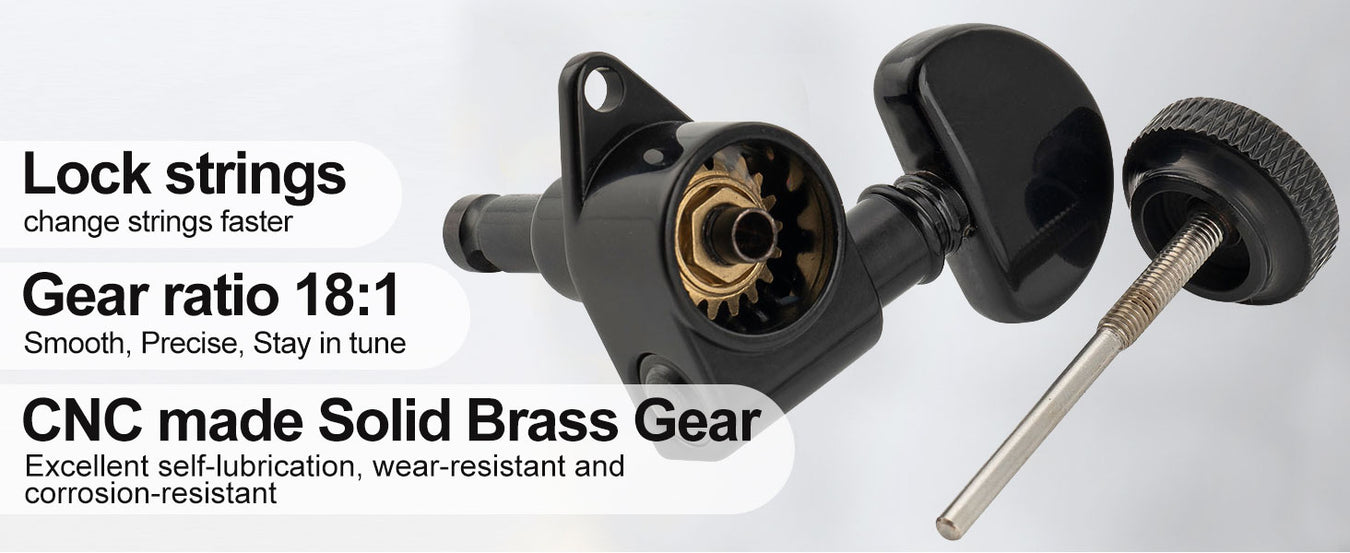 - Gear ratio 18:1, the retaining mechanism lock the strings in place, preventing them from slipping, improve tuning stability and make string changes much faster, turn smoothly and precisely, keep your guitar stays in tune