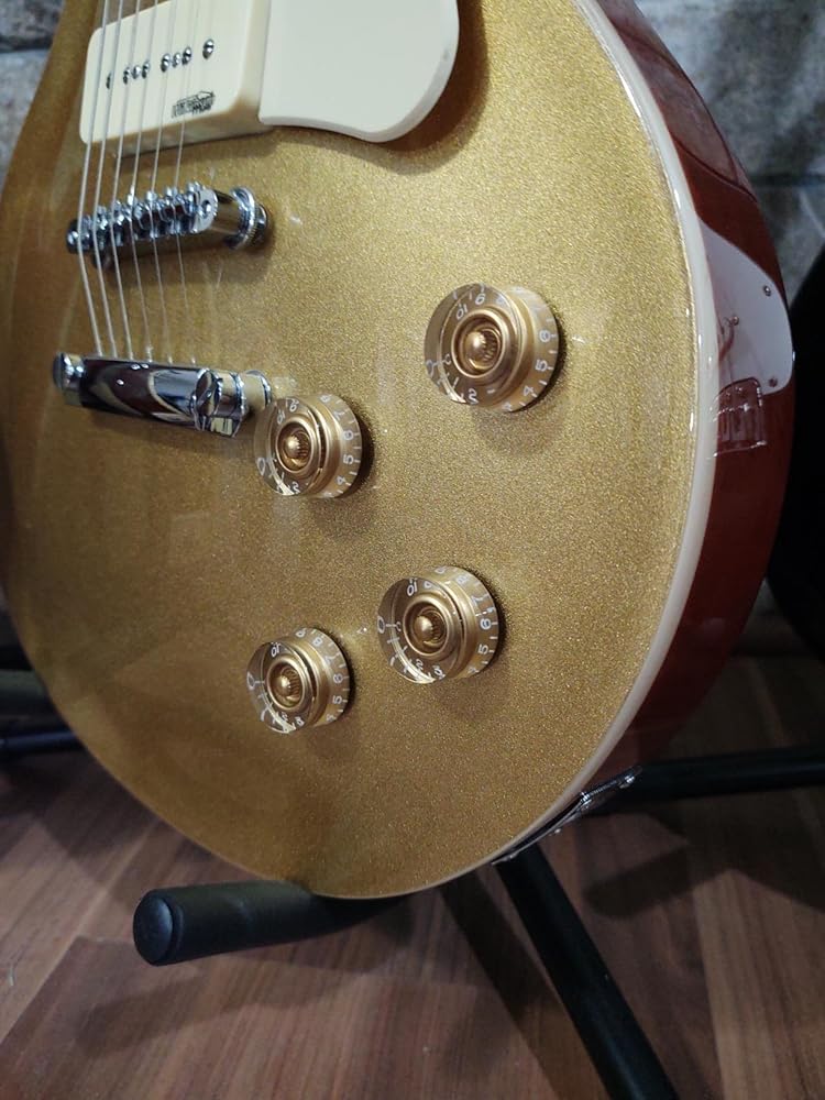 I did not care for the gold colored bell knobs that came stock on my Harley Benton HB35 and knew right away they had to go. After searching around online, I found these cream colored Musiclily speed knobs on Amazon that looked like they might be better choice. Well, in my opinion they are the perfect knobs for the guitar.The main color of the knobs is cream but there is a gold highlight area on the top of the knobs and black numbers around the bottoms. The front of the guitar has a touch of orange around the outer edges that quickly transitions into a lemon yellow. The pick guard, toggle switch tip, and pickup trim are a cream color so these knobs blend in very well on the guitar and they feel very nice when playing.Please note that these plastic knobs will fit split shafts with 18 splines. They will NOT fit 24 spline shafts.I��ve attached a couple of photos showing the new knobs installed and an original knob sitting beside a new one for comparison.