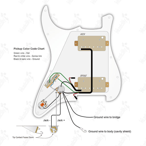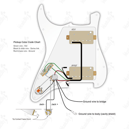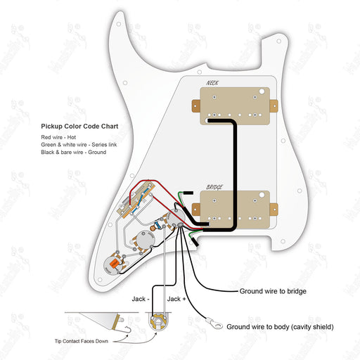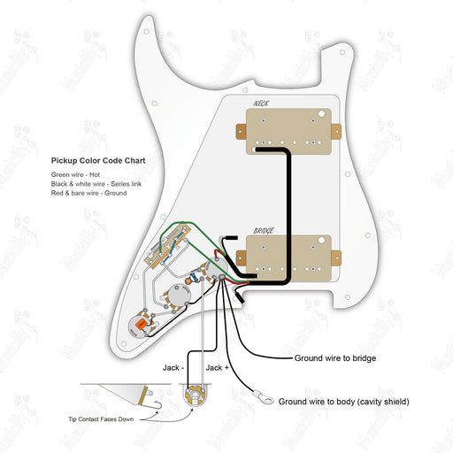 Wiring diagram of the standard ST-HH 2 pots pre-wired pickguard with Musiclily Basic pickup and American switch.