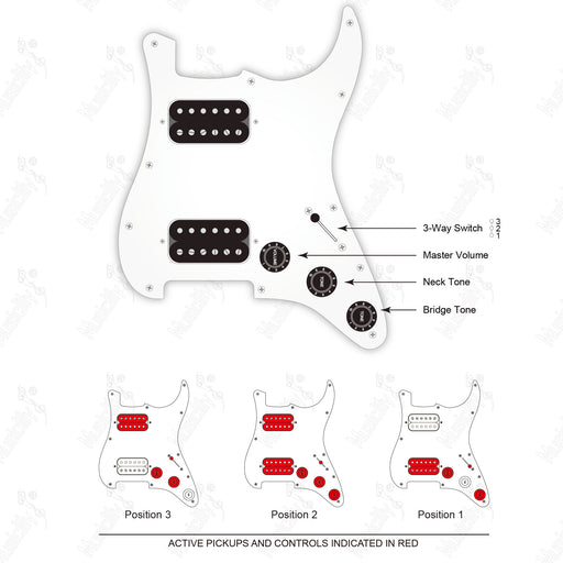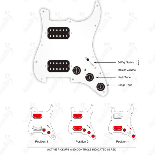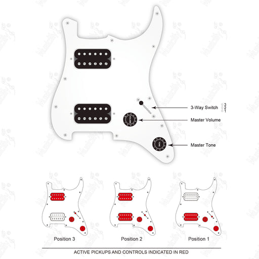 Wiring diagram of the standard ST-HH 2 pots pre-wired pickguard with Musiclily Pro pickup and American switch.
