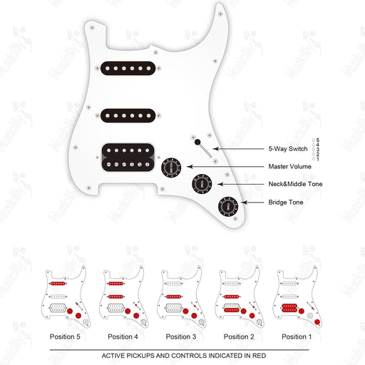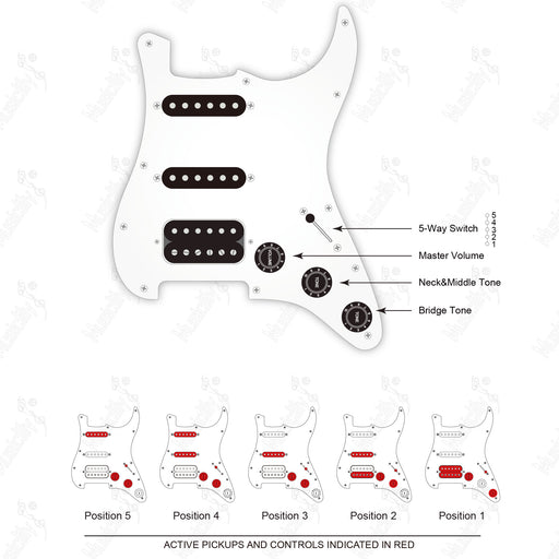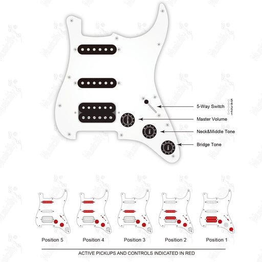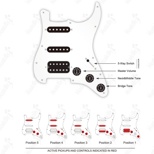 Wiring diagram of the ST-HSS Auto-Split & Matched Load pre-wired pickguard with Musiclily Pro pickup and American switch.