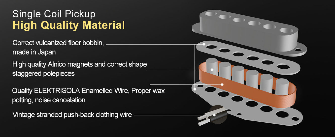 - Resistencia/inductancia (mástil/medio/puente): 6,1K/6,1K/16,6K, 2,6H/2,6H/8,3H. Tolerancia: bobina simple 0,5K, humbucker 1K. El valor de resistencia cambiará según la temperatura y la humedad. Por lo general, el valor será alto en clima cálido y seco, y bajo en clima frío y húmedo. En casos extremos, la tolerancia será mayor. Imán: Alnico 5; mástil/medio: carrete y placa base de fibra; cableado: 2P (cable de tela vintage); puente: placa base de plata níquel; carrete de PC; una fila de tornillos ajustables; cableado: 4P Shield.