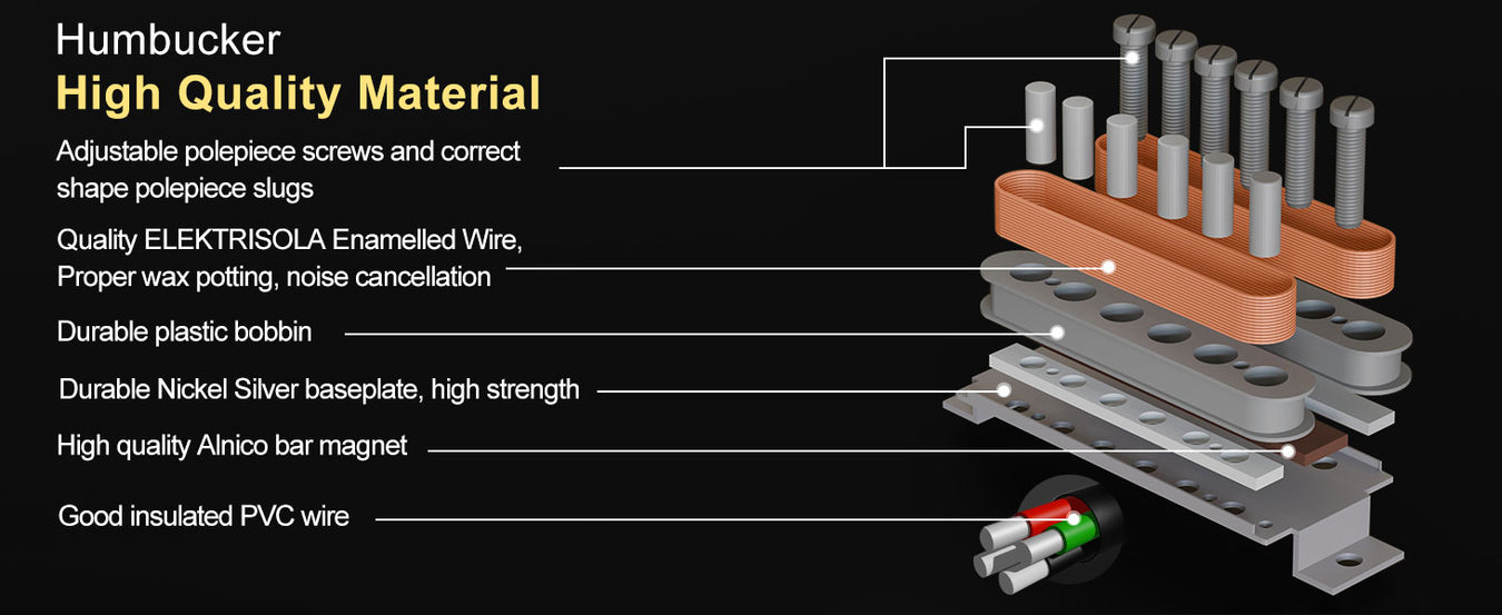 - El paquete incluye: conjunto de pastillas para mástil, medio y puente, junto con accesorios de montaje. Nota: Nuestros tornillos pueden no ser compatibles con su uso, por favor utilice los suyos propios si es posible.