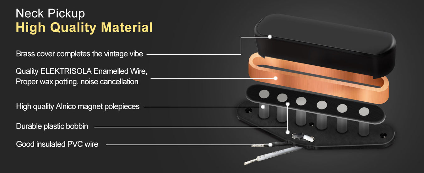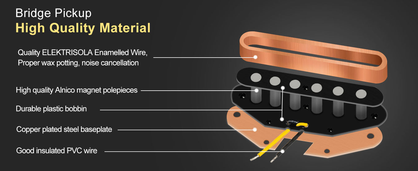 - Résistance (manche/chevalet) : 8,2K/7,3K, inductance (manche/chevalet) : 2,2H/3,2H. Tolérance : 0,5K pour simple bobinage, 1K pour double bobinage. La valeur de résistance varie en fonction de la température et de l'humidité. En général, la résistance sera élevée par temps chaud et sec, et plus basse par temps froid et humide. Dans des cas extrêmes, la tolérance de la résistance sera plus importante. Aimant : Alnico 5 ; bobine et plaque de base en plastique ABS ; plaque de base du chevalet plaquée cuivre, câblage : PVC 2P.