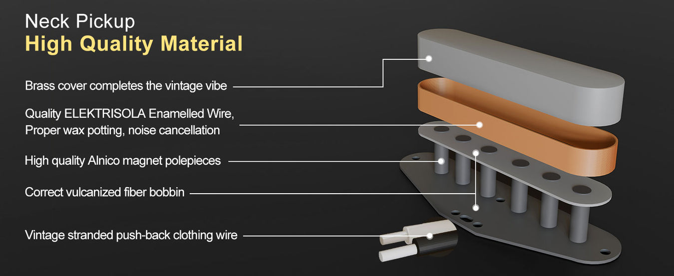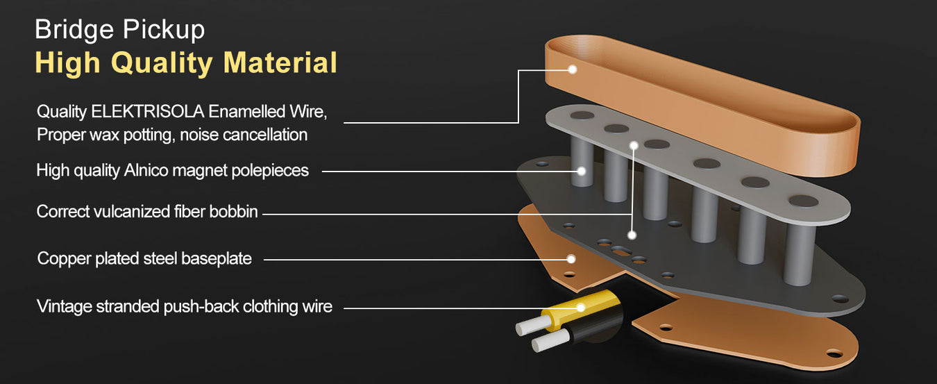 - Résistance (manche/pont) : 8,1K/7,4K, inductance (manche/pont) : 1,8H/3,6H. Tolérance : 0,5K pour simple bobine, 1K pour double bobine. La valeur de résistance changera en fonction de la température et de l'humidité. Généralement, elle sera élevée par temps chaud et sec, et faible par temps froid et humide. Dans des cas extrêmes, la tolérance de la valeur de résistance sera plus importante. Aimant : Alnico 5 ; bobine en fibre ; plaque de base du pont plaquée cuivre, câblage : 2P.
