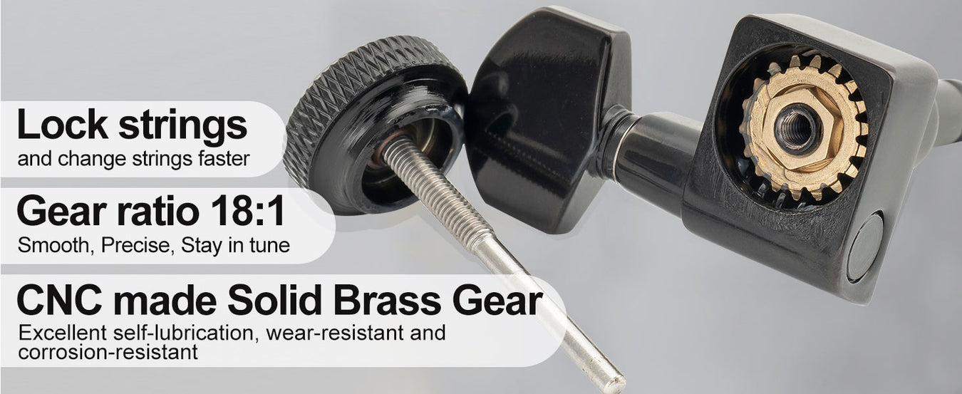 In realtà, gli accordatori da 30 dollari non dovrebbero essere un miglioramento per una chitarra da più di 1000 dollari, ma questi hanno aggiunto così tanta stabilità di accordatura al mio Jazzmaster. Ho aggiornato diversi tipi di chitarre con accordatori bloccanti, e questi sono quasi allo stesso livello di altri set che costano almeno 2-3 volte tanto. Sono leggermente meno precisi, si sente che sono più economici e bloccano le due diverse altezze degli alberi che alcuni hanno, ma sono al 90% simili in termini di aspetto, sensazione e funzionalità. Si sentono un po' appiccicosi, ma è solo una questione di sensazione, funzionano benissimo. Hanno un bel peso, si avvitano facilmente e sono sostituzioni dirette. Sono rimasto molto colpito da questi.