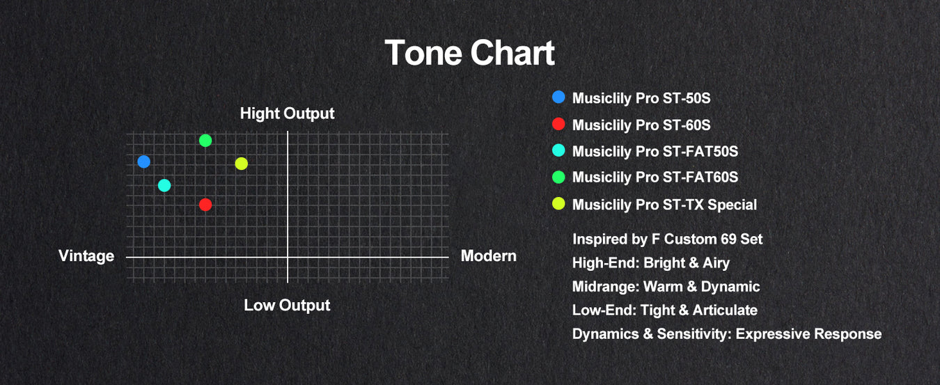 - スタッガード Alnico 5 マグネットポールピースピックアップ、ヴィンテージスタイルのトーン。F Custom 69 ストラトピックアップに似ています。バランスの取れた出力を実現するスタッガードポールピース、ハムキャンセルのために逆巻き逆極性 (RWRP) のセンター(ミドル)ピックアップを採用。クリアで透明感のある高音と重厚な低音を生み出し、ペダルとの相性が特に良く、低音域が力強く響き、高音域が伸びやかに広がります。ブルース、ロック、クラシックロックに最適です。