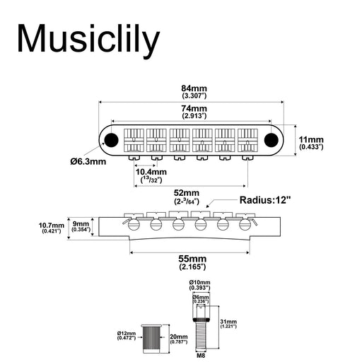 Epiphone LP/SGと他の似ているスタイルなエレキギターに適用ABR-1スタイル,11mmナローサイズ,弦ピッチ:10.4mm,1弦〜6弦の間隔: 10.4x5=52mm(2-3/64インチ),ポスト間隔:74mm(2-29/32インチ).ブッシング外径:12mm (15/32インチ)...