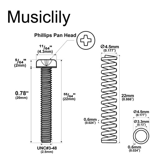 Musiclily UltraFender USA/メキシコスタイルのエレクトリックギター用ハムバッカーピックアップ取り付け用 UNC#3-48X0.78インチネジ、ねじ直径:2.5mm(3/32インチ)、ねじ長さ:20mm(0.78インチ);バネ内径および自由長:3.3mm(1/8インチ)および22mm(55/64イン...