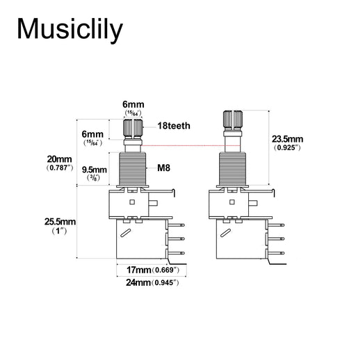 アジア製とほとんどのミリ規格のインポートエレキギター/ベースに適用粗い18スプラインのスプリットシャフト径:6mm(15/64インチ)、メートルサイズのM8ネジ、直径8mm、ねじ切り部高さ:9.5mm(3/8インチ)フルブラス製シャフトとブッシング、より良い導電性を持ちますAカーブ、抵抗値: ...