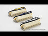 - 抵抗値(ネック/ミドル/ブリッジ):5.6K/5.6K/6.8K、インダクタンス(ネック/ミドル/ブリッジ):2.2H/2.2H/3.0H。許容差:シングルコイルの場合±0.5K、ハムバッカーの場合±1K。抵抗値は温度や湿度によって変化します。通常、暑くて乾燥した天候では抵抗値が高く、寒くて湿った天候では低くなります。極端な場合、抵抗値の許容差が大きくなります。マグネット:アルニコ5;ボビンおよびベースプレートはABS樹脂製;配線:PVC 2P