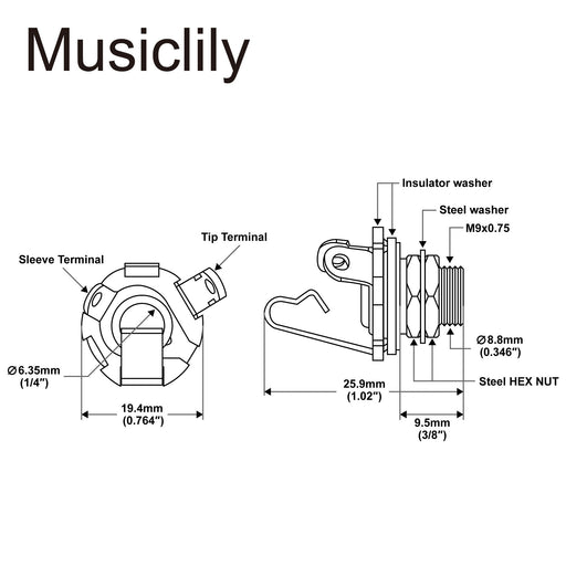 エレキギターやベースに適用標準の6.35mm(1/4インチ)ジャックソケット,ねじ部外径:12mm(15/32インチ),端子なしの長さ:40mm( 1 -37/64インチ),端子を含む長さ:47.6mm (1-7/8インチ)モノラルまたはステレオの配線が可能,TIP端子にホット線,RINGにバ...